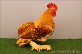 Ruhlaer Zwerg-Kaulhühner gelb mit weißen Tupfen