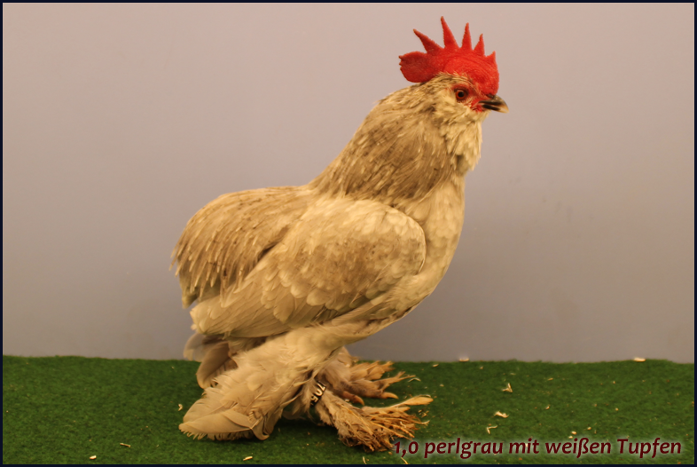 Ruhlaer Zwerg-Kaulhühner perlgrau mit weißen Tupfen